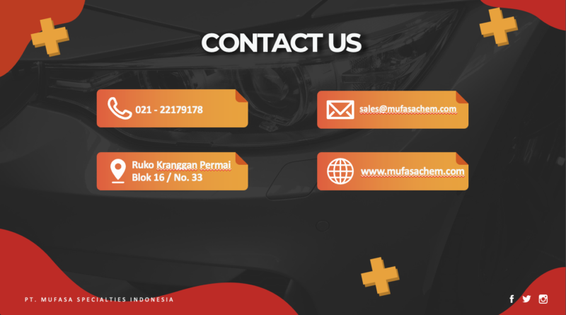 PT. Mufasa Specialties Indonesia Jalan Raya Alternatif Cibubur Ruko Kranggan Permai Blok 16 / No. 33 Telp. 021-22179178 Mobile-1 : 0812-9656-9873 Mobile-2 : 0899-1996-521 Mobile-3 : 0878-8418-6501 Mobile-4 : 0895-1319-0389 Fax. 021-22179178 Website : www.mufasachem.co.id